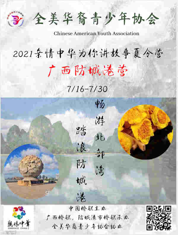 美国东部时间7月16日晚上八点,由中国侨联主办,广西壮族自治区侨联、防城港市侨联承办,全美华裔青少年协会协办的2021“亲情中华·为你讲故事”网上夏令营广西防城港营在Zoom云开营。来自全美华裔青少年协会的300多名营员,将在接下来的十五天里,每天听中华传统故事、名人故事,完成作业打卡,领略中华优秀传统文化,并通过防城港市侨联举办的系列特色讲座活动,走进防城港这座“西南门户、边陲明珠”,共同去体验中国大陆海岸线最西南端的无穷魅力!