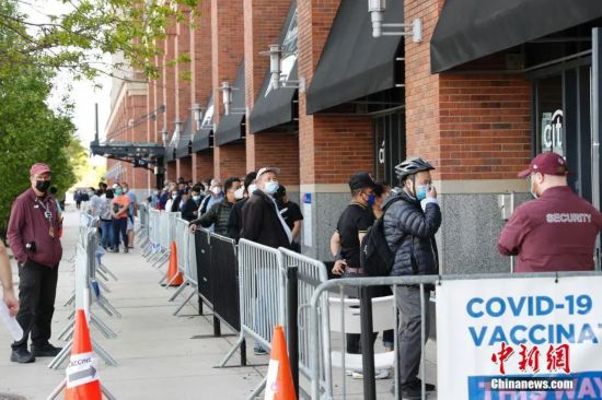 资料图:美国纽约大都会棒球队主场花旗球场新冠疫苗接种点,民众排队接种疫苗。中新社记者 廖攀 摄