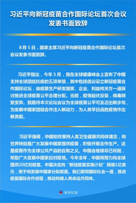 新华社北京8月5日电 8月5日,国家主席习近平向新冠疫苗合作国际论坛首次会议发表书面致辞。