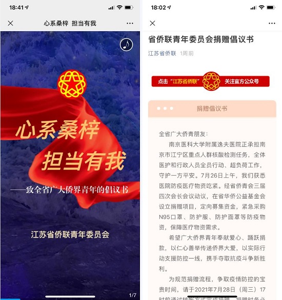 江苏省侨联青年委员会、省华侨公益基金会第一时间发出倡议,发动广大侨胞、侨青以不同方式支持抗疫。省侨青会以微信形式多次召开会长会议,研究决定通过省华侨公益基金会设立“侨青助力抗疫”捐赠项目和款项使用等议题,启动支持一线抗疫公益行动。仅用48小时就募集了30余万元善款,紧急采购N95口罩、医用外科口罩、医用防护衣和防护面罩等医疗防疫物资,驰援位于疫情重点区域、承担重点人群核酸采集和收治任务的南京医科大学附属逸夫医院。