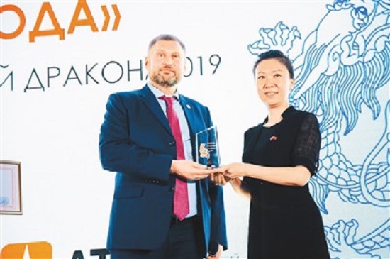 2019年,在俄罗斯亚洲工业企业家联合会年会上,原毅(右)领取联合会主席颁发的年度律所奖。
