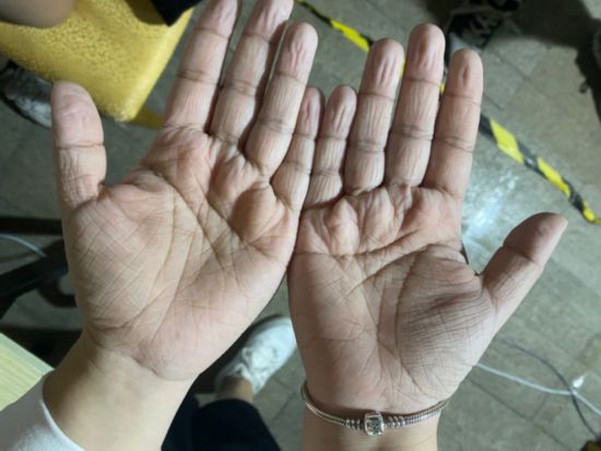 青年志愿者—侨属杜西敏,从7月28日武陵源,疫情暴发至今,一直在核酸检测点(国宾酒店)参加志愿服务,戴着套进行人员信息录入。一天下来,“白胖”的手。
