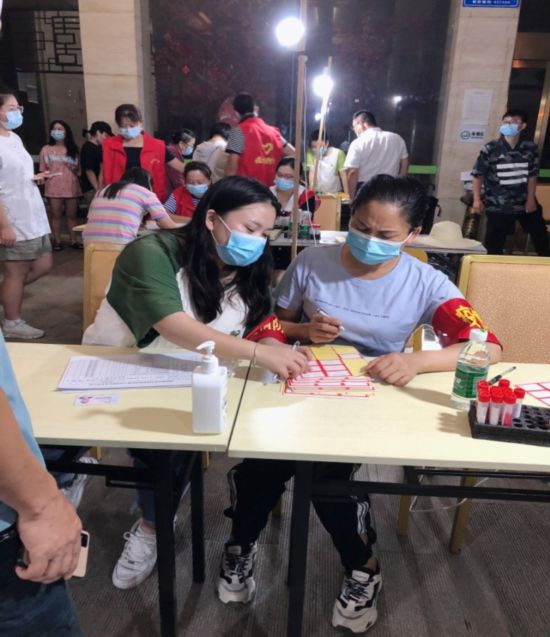 7月29日晚,侨联主席覃兰英(右)在核酸检测点(国宾酒店)为核酸检测人员进行信息登记