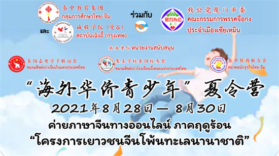 由致公党福建厦门市委主办,泰国嘉庚学子联谊会、集美学校泰国校友会、泰中侨商联合会协办,泰中教育集团、诚毅学院(曼谷)承办的2021海外华裔青少年夏令营(线上)开营啦! 本次夏令营通过录制视频课程、线上播放的方式,让孩子们不用走出国门,就能体验到中华优秀传统文化的博大精深,感受到来自祖(籍)国的关心。致公党厦门市委专职副主委李瑞盛在开营仪式上致辞,共有近百名来自泰国和印尼的师生参与,希望营员们能通过本次线上夏令营充分领略中华文化的博大精深,继承和发扬嘉庚精神,做中华民族优秀文化与世界各国文化交流的传播者、促进者,积极与亲朋好友交流在学习中领悟到的中华文化精髓,增强对中华文化的认知,发挥好祖(籍)国和所在国之间的沟通桥梁作用。