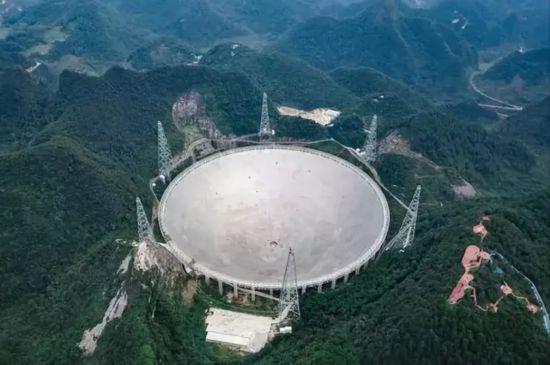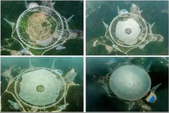 FAST项目从安装第一块反射面板到即将完成的过程。左上:FAST安装第一块反射面板(2015年8月2日摄);右上:FAST反射面板安装近半(2015年12月16日摄);左下:FAST反射面板安装近八成(2016年3月9日摄);右下:FAST反射面板安装完成(2016年7月3日摄)