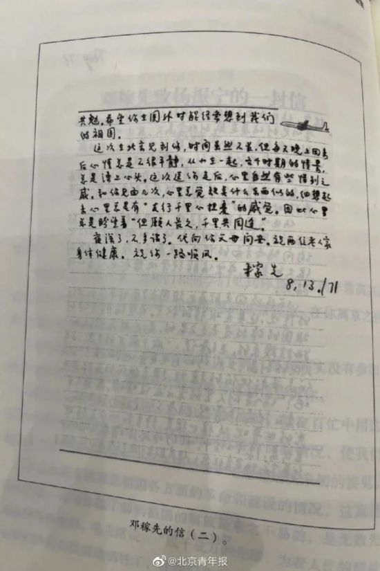 在信的末尾,邓稼先写道:但愿人长久,千里共同途。当时,杨振宁没看懂这句话。50年后杨振宁回应邓稼先的信,他说:“我觉得今天五十年以后,我可以跟邓稼先说:稼先,我懂你‘共同途’的意思,我可以很自信地跟你说,我这以后五十年是符合你‘共同途’的瞩望,我相信你也会满意的。”