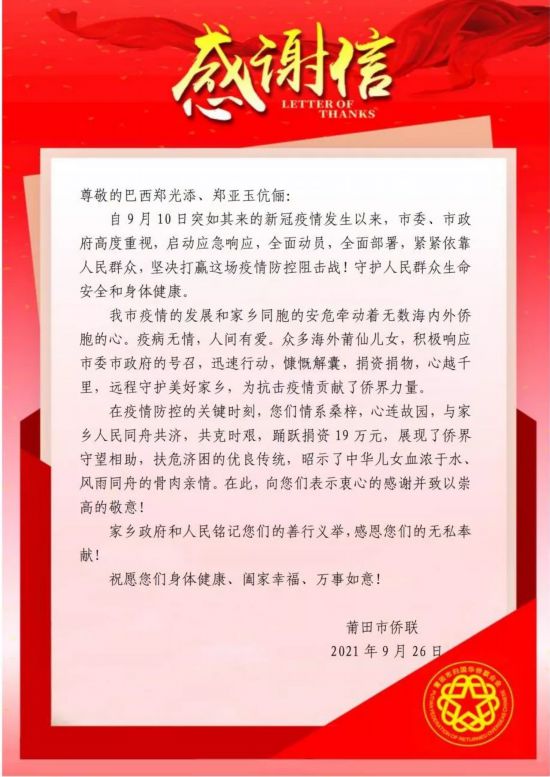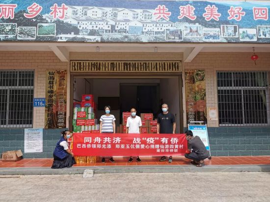 巴西华侨华人促进中国和平统一联合会常务副会长郑光添先生和夫人郑亚玉女士,在疫情面前,情系家乡,无私奉献,先后捐资19万元,支援家乡抗击疫情。郑光添、郑亚玉伉俪说,“莆田是我们的‘根’,家乡遭到疫情的袭击,给家乡人民生产和生活带来严重影响,作为海外游子,我们有责任为家乡做点事,助力家乡早日打赢疫情防控战”。疫情发生后,他们夫妇时刻关注疫情情况,积极响应社会责任要求,向他们老家的北岸经济开发区捐赠10万元,向东埔镇捐款5万元,向东坑村捐款1万,助力防控疫情,为守护家园、打赢战“疫”贡献力量。
