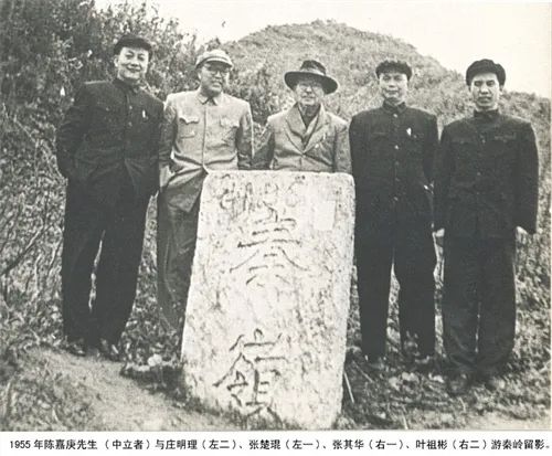 1955年,张楚琨(左一)陪陈嘉庚(中),与庄明理(左二)、张其华(右一)、叶祖彬(右二)游秦岭