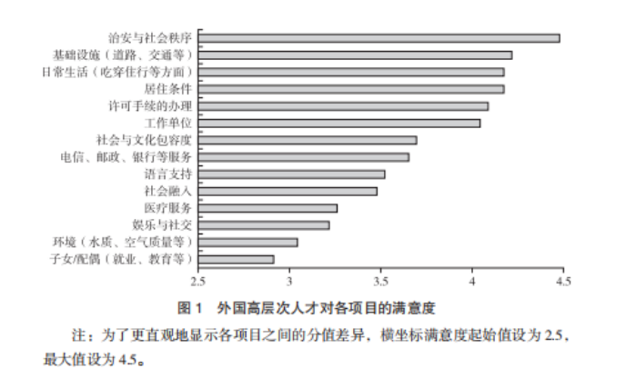 对外国高层次人才在华工作生活状况进行全面了解的尝试,比较典型的例子是中国海外高层次人才交流与开发研究会建立的“外国专家在华工作生活情况数据库”。该数据库主要收集外国专家基本信息,出入境信息,居留情况,对中国历史文化、社会现状了解与认同情况,对中国及政府的建议与期待等,总体上是一个涵盖面比较全的数据库,但是该数据库收集的主要是关于人才的“硬”数据,对于反映其在华工作生活的满意度等“软”数据涉猎不够。与此同时,部分学者也将视角投向了外国高层次人才的适应与融入方面,比如胡艳对义乌的外国高层次人才文化适应与融入问题进行了研究,指出他们存在个人价值无法展示和最大化,社交、文化生活资源匮乏等问题。何敏与于天祚则分别从亲情、爱情、友情三个维度分析了情感因素对海外优秀青年人才回流的影响。部分学者还对人才某些方面的满意度进行了探讨,如纪韶与朱志胜对外国高层次人才回国就业质量及其满意度进行了实证研究,分别测量了就业所涉及的市场绩效、市场环境、政策扶持、政策执行这四个方面的满意度。