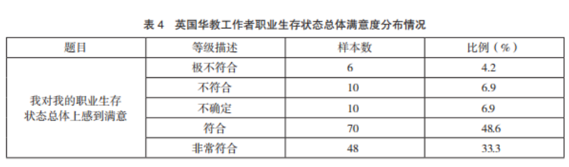 在对试测样本进行分析后,研究人员对问卷题目做了进一步的删减与微调。正式问卷题目共30道,满分150分,涉及职业生存状态的整体水平及各个子维度水平的调查。随后根据目的性取样和便利性取样原则,在2018 年底至2019 年上半年利用网络调查方式,将问卷发放到各地的英国华文教师微信群、教师论坛等交流平台,并通过网络搜索英国各地华文学校联系邮箱发放问卷。最终回收问卷176份,其中有效问卷144份,有效率81.8%。正式问卷信度值为0.95,效度值为0.875,问卷的信效度较高。问卷回收后,采用SPSS20软件对数据进行分析。
