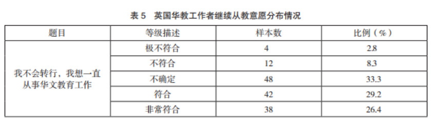 继续从教意愿的均值为3.68,略高于中值3,具体选择分布如表5所示。受访者中仅有半数人具有较高的职业忠诚度;三分之一的人仍处在摇摆状态,对未来发展不够明朗;而十分之一的人离职意愿强烈。因此,如何争取摇摆状态的人?如何减少离职率?这是英国华文教育可持续发展不可回避的问题。