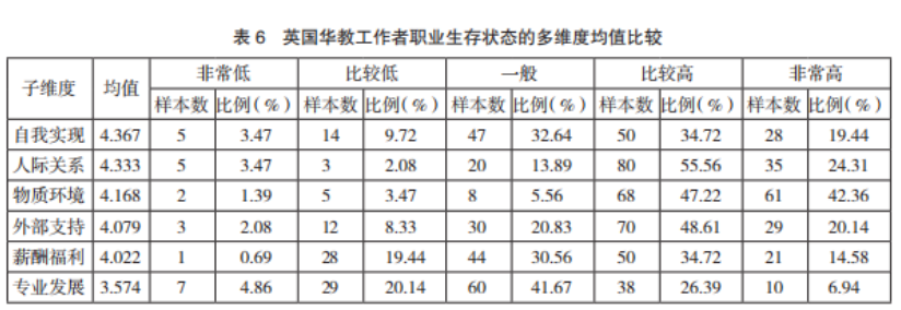 把各个题项分为六个维度进行统计整理,可以揭示华教工作者职业生存状态的不同侧面。如表6所示,调查对象职业生存状态各维度均值由高到低依次是:自我实现>人际关系>物质环境>外部支持>薪酬福利>专业发展。其中,受访者对“自我实现”满意度最高,表明华文教育工作在很大程度上促进了受访者自我价值的实现,其工作得到了学生、家长、家人、当地民众的认可。相反,受访者对“专业发展”的满意度最低,说明他们接受再教育、再学习的意识强烈,但培训进修、晋级升等的渠道有限,专业发展遭遇“天花板”。