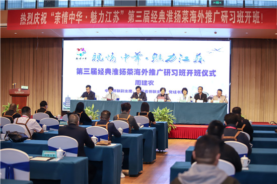 10月16日,由中国侨联指导,江苏省侨联主办,常州市侨联和常州旅游商贸高等职业技术学校共同承办的“亲情中华?魅力江苏”第三届经典淮扬菜海外推广研习班在常州举行开班仪式。周建农、邢砚庄,中共常州市委常委、宣传部部长、副市长杭勇,常州旅游商贸高等职业技术学校党委书记蔡廷伟等,以及来自21个国家的近30位海外中餐从业者、餐饮业协会负责人、侨团侨领出席开班仪式。开班仪式结束后,中国烹饪协会第五届、第六届副会长、中国中央电视台大型电视纪录片《舌尖上的中国1、2、3》首席顾问、总顾问边疆,中国烹饪大师,淮扬菜烹饪大师、扬州大学旅游烹饪学院食品与科学工程学院副院长孟祥忍教授分别作了《中国美食文化的传承与创新》《淮扬菜烹饪技艺的形成与特色》的专题授课。