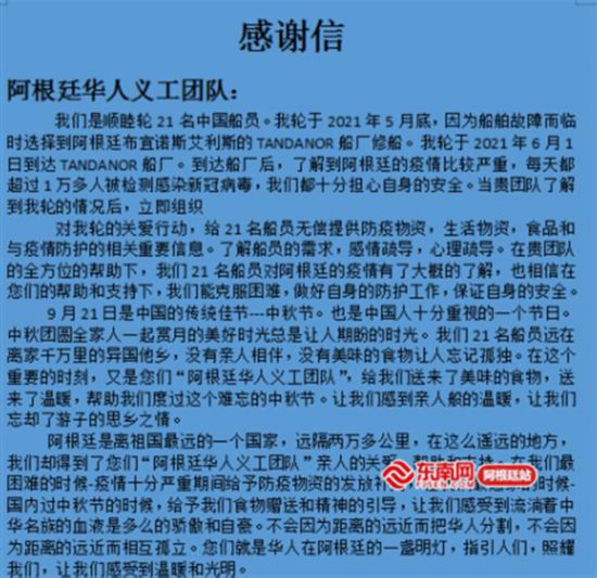 顺睦轮全体船员在写给义工团队的感谢信中写道,9月21日是中国的传统佳节中秋节,是中国人十分重视的一个节日。21名船员远在离家万里的异国他乡,少了亲人相伴,没有美味的食物让人忘记孤独。在这个重要的时刻,阿根廷华人义工团队送来了美味的食物和温暖,让他们度过一个难忘的中秋节,让他们忘却了游子的思乡之情。