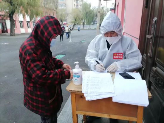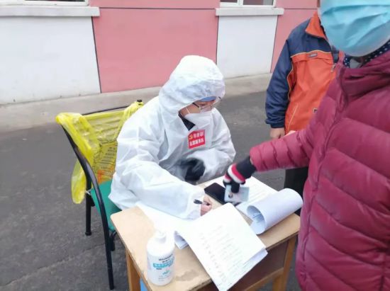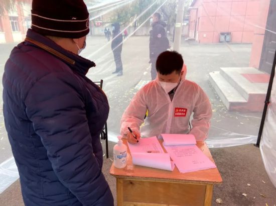 (上图)秘书处三级主任科员王庆旭为核酸检测群众详细登记身份信息