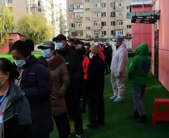 (上图)联络处(海外联谊处)副处长常鸣组织核酸检测群众有序排队