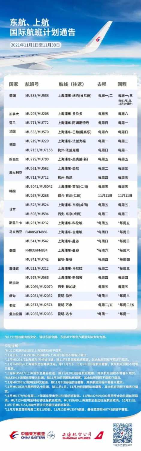 自2021年11月1日0时至2021年11月30日24时止,东航、上航每周可执行国际航线共计23条,其中涉及上海航线 14条,昆明航线4条,杭州航线2条,西安航线2条,烟台航线1条。具体航班计划如下: