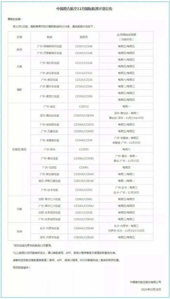 自11月1日起,南航每周可执行国际航线共计24条,具体航班计划如下:
