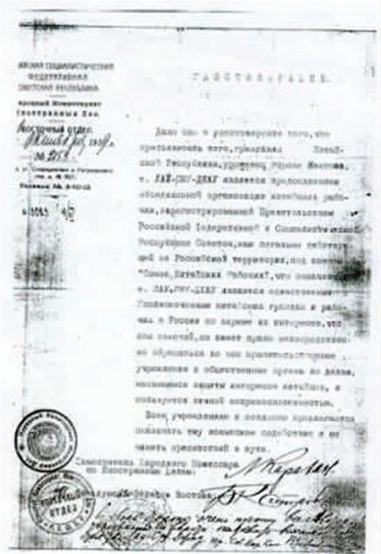 1919年11月19日,为解决联合会工作问题,刘泽荣第二次见到列宁。列宁亲切地与刘泽荣谈了近1个小时。刘泽荣将苏维埃外交部发给他的证明书给列宁看,内容为: