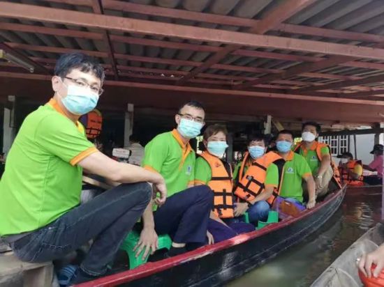 泰国泉州晋江联合总会会长蔡上新、执行会长陈俞龙、副会长许清流、洪世界、张孚杰、常务理事黄淑芬、顾问许宗会乘小船进入灾区