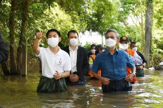 泰国国会主席川立派阁下、伊沙拉国会议员、信武里府尹等步行或乘船赴灾区第一线