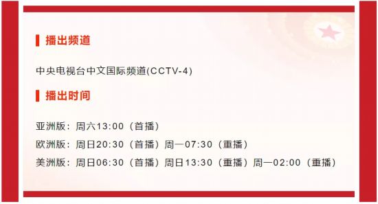 《追梦中华·百年赤子心》纪录片作为中央电视台中文国际频道特别节目,于2021年10月2日开始播出,每周一集,敬请收看。