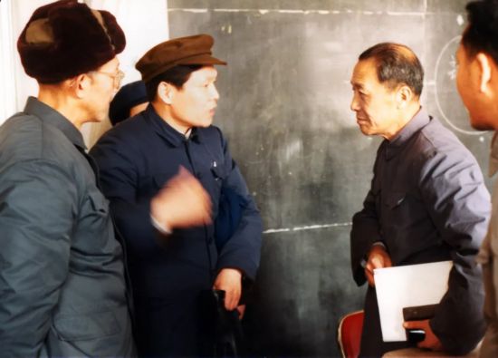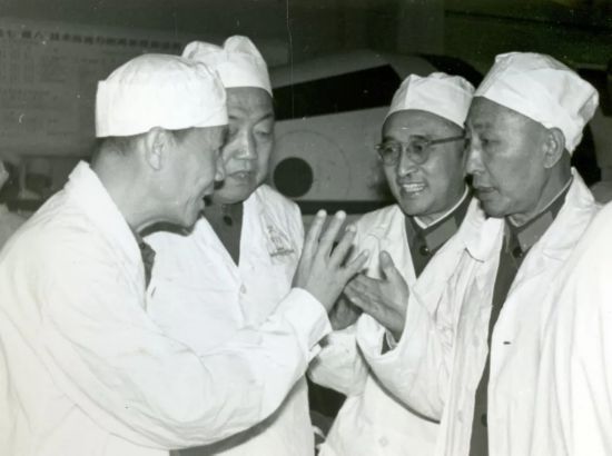 黄纬禄(左一)在试验基地厂房内向原国防科工委及航天工业部领导介绍情况