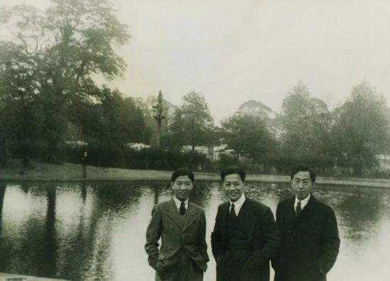 1946年黄纬禄(中)在英国伦敦住所附近与室友合影