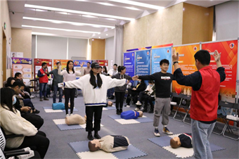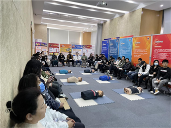 活动现场布置了应急教项目宣传展板、消防安全与地震逃生知识展板、设立AED与应急装备学习体验区等,向50余位参与人员广泛普及各类自然灾害、安全事故及应急包扎的重要性。活动通过现场讲解个人防护装备、心肺复苏及AED使用、气道异物梗阻急救、止血包扎、伤员搬运(简易担架)、火灾扑救等基础知识并结合相关工具现场实操演示体验,使企业员工对消防安全知识以及灭火器材的操作有了更深的认识和掌握,增强大家的应急安全意识。