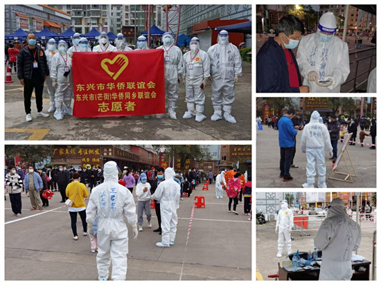 12月24日,抗疫进入第四天,连日奋战的一线抗疫的工作人员已经十分疲惫,而全市全员核酸检测工作次日凌晨马上又要进行。在这困难时刻,防城港市侨联副主席裴铁明、东兴市华侨联谊会会长黎永东、理事长王君华紧急谋划,迅速组建“东兴市华侨联谊会志愿者微信群”,积极支援抗疫。征集志愿者的消息刚发出,就有97名归侨侨眷踊跃报名,很快,一支由归侨侨眷组成的侨界志愿者队伍组建了起来,火速赶往抗疫一线支援全员核酸检测工作。东兴市当日的气温依然居高,在义乌广场上支援核酸检测的侨界志愿者们穿着密不透风的防护服,个个焖出了满身大汗,但是他们不顾个人安危,毅然坚持工作。协助扫码检测,提醒安全防护,维护现场秩序,有效保障核酸检测工作的顺利进行,充分体现了东兴归侨侨眷勇于担当的社会责任。