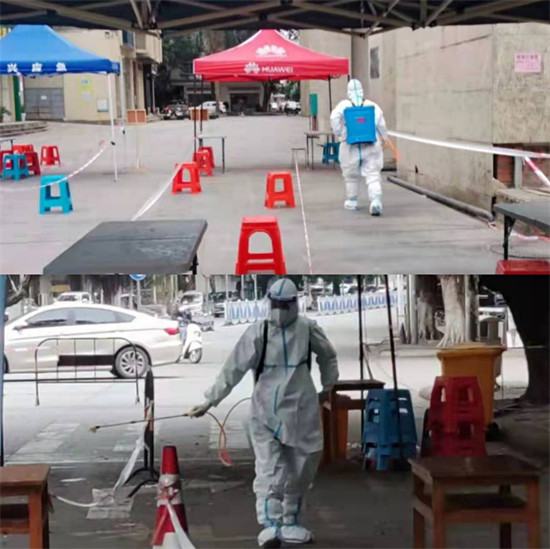疫情防控哪里有需要,侨界志愿者就到哪里支援。北郊社区、中山社区和花溪社区的14个核酸检测采样点上,一个个特别的白衣“消防员”背着沈重的消毒液在认真对检测场所进行消杀。