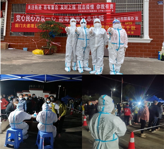 东兴市侨联乡村振兴工作的联系挂钩点江平镇江龙村是这次疫情的中高风险区所在地。12月20日凌晨1点40分,东兴市侨联主席苏娴接到疫情防控通知后,马上带领另外3位同事来到江龙村委参加核酸检测工作。时间就是生命,她们不顾个人安危,化身“白衣战士”投入战“疫”,通宵达旦连续奋战18小时,争分夺秒展开疫情阻击战,保障人民群众生命安全。截至12月30日,东兴市侨联4位姑娘们每天披星戴月往返江龙村,配合村委组织全村9500多名村民进行了7次全员核酸检测。战“疫”中,她们和声细语疏导村民有序排队、耐心细致做好信息登记,鼓励村民树立战胜疫情的信心,她们的微笑像一缕阳光照进村民的心里,村民们亲切地称呼她们为“侨联四朵金花”。