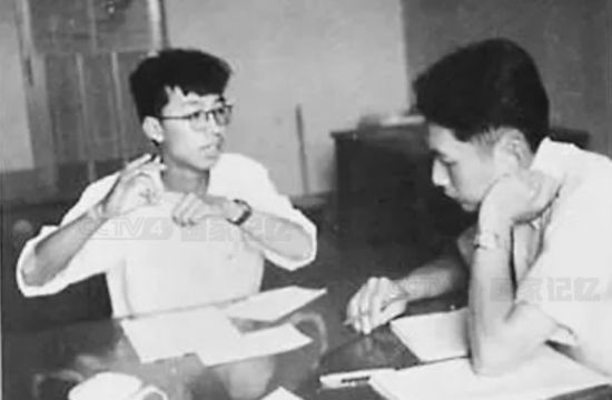 图:教授朱光亚(右)与学生陈佳洱(左)