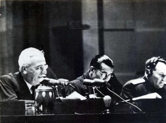(图:拍摄于远东国际军事法庭审判席的照片,中间为梅汝璈)