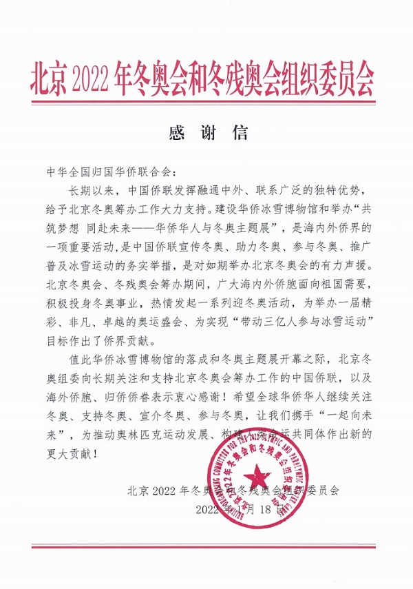 北京2022年冬奥组委通过中国侨联致谢海内外侨胞支持筹办北京冬奥