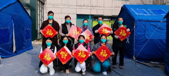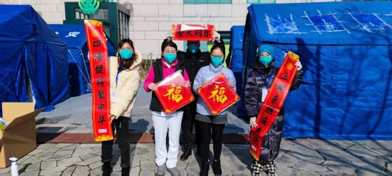 在恒丰园1号楼检测点和恒丰园3号楼检测点,待现场核酸筛查工作完成后,新村街道工作人员把100多个福字和40多副春联,送到现场医务人员、社区工作者和志愿者手中,感谢他们的辛勤付出,为他们送上新春的祝福。