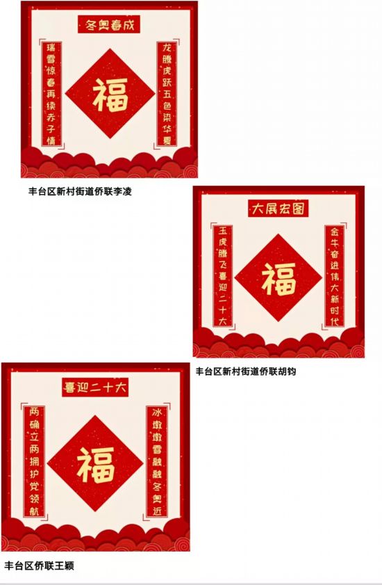 “过小年,贴春联”。小年以后,家家户户都要写春联,贴福字。据了解,以下这些春联内容是丰台区侨联、新村街道侨联的归侨侨眷参加北京市侨联组织的“送福进千家”活动的部分作品。之后由北京市侨联择优印制了祝福春联,通过全市基层侨联组织送到广大侨界群众。