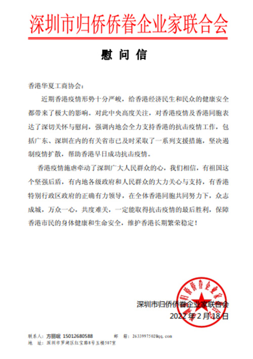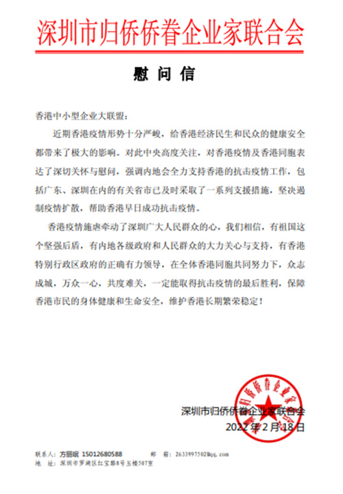 深圳市侨企联分别给香港华夏工商协会、香港汕头商会、香港中小型企业大联盟等友好商协会发去了慰问信,表达了守望相助的同胞之情。深圳市华侨公益基金会、市侨媛协会等深圳侨界社团也纷纷行动起来,发动会员根据香港社会的需要,提供有针对性的支持和帮助。大家坚信,有了祖国和内地同胞的支持,深港各界守望相助,香港一定能够早日战胜疫情。