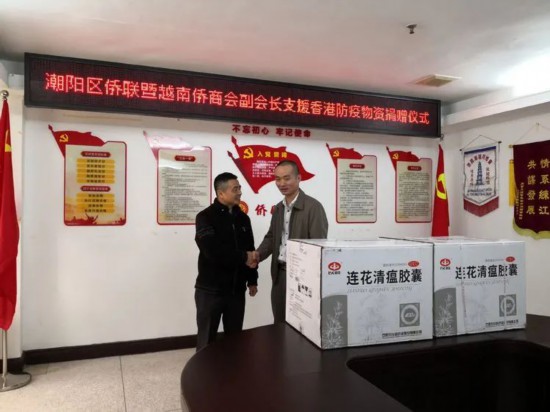 在潮侨界热心人士、企业家、著名商人纷纷表示愿意慷慨解囊捐赠资金、采购N95口罩、医用防护服、抗疫药品等防疫物资支援在港潮籍乡亲防疫抗疫。越南粤侨商会副会长、汕头市侨界青年联合会常务理事、潮阳区侨联名誉主席张盛龙先生得知情况后,立即行动,四处寻找防疫物资供应商,几经辗转采购到一批防疫药品“连花清瘟胶囊”,并亲自送到潮阳区侨联,助力香港同胞抗疫,为香港潮籍乡亲送去一片温情。接下来潮阳区侨联将继续行动,携手海内外潮籍乡亲与香港同胞共同抗击疫情,共建美好家园,共创幸福安康生活。