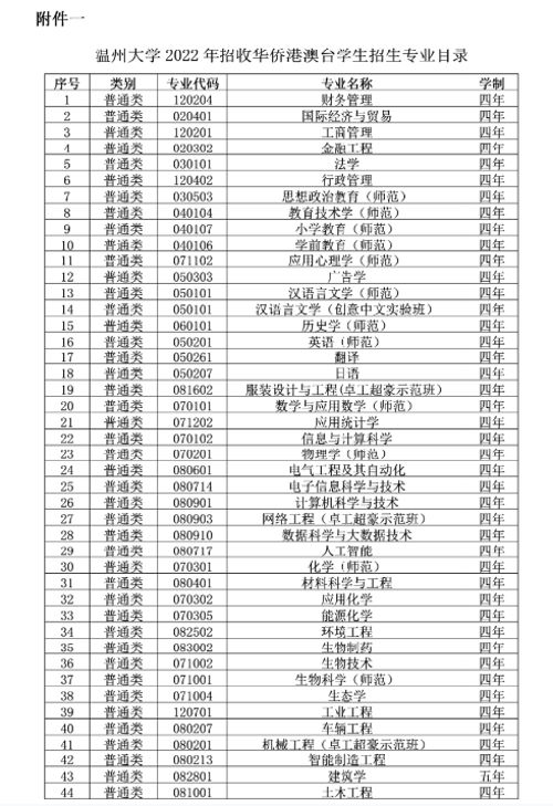 2022年温州大学面向华侨港澳台联招计划为5人,招生专业目录见附件一(最终招生专业和计划以上报联招办审核公布为准)。