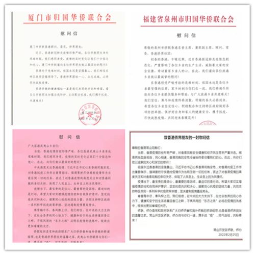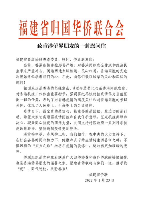 香港疫情发生以后,福建省侨联第一时间向香港侨界发出《致香港侨界朋友的一封慰问信》,表达对香港侨界和香港同胞的亲切慰问,同时组织专班力量了解旅港乡亲身体状况和各类需求,及时开展人文关怀。全省各级侨联干部通过电话、短信、微信、慰问信或捐赠物资等方式,向香港侨界、闽籍代表人士、社团负责人、省侨联香港委员、顾问等转达家乡人民的关心慰问。