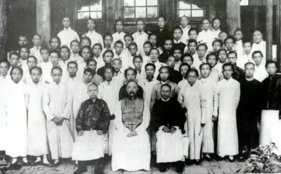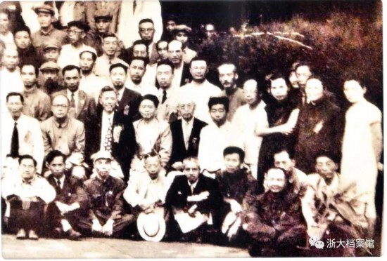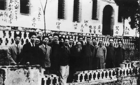 浙江大学部分教师马一浮(右7)、梅光迪(右8)、张其昀(右5)、祝文白(右3)、王驾吾(右2)、陈训慈(右1)等在浙大图书馆前合影(1938年摄于江西泰和)