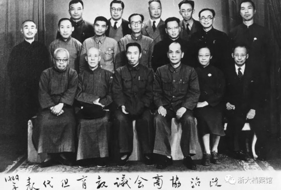 1949年,竺可桢(前排右1)出席新中国第一届政治协商会议时与教育组代表合影