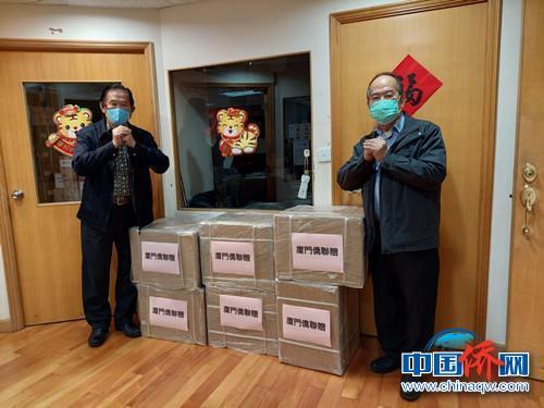 香港侨友社会长黄英来(右)、监事长王钦贤(左)接收捐赠物资。 肖家豪 摄