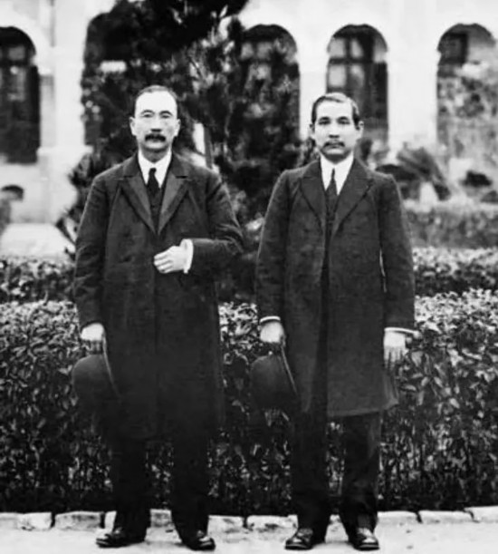 1912年3月25日,孙中山在南京总统府前与袁世凯任命的内阁总理唐绍仪(左)合影