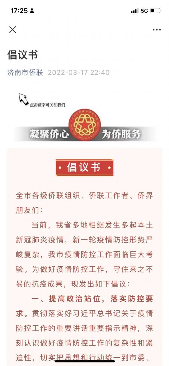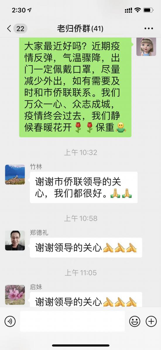 向全市各级侨联组织、侨联工作者、侨界朋友发出倡议,号召大家落实防控要求,以高度的政治自觉、强烈责任担当、严密的防控措施、扎实的工作作风投身抗疫工作;争做抗疫先锋,在落实防控措施、维护社会秩序、助力安全生产等方面作表率、当先锋;彰显侨界担当,不造谣、不信谣、不传谣,积极传播抗疫正能量,讲好侨界抗疫故事,营造良好舆论环境,坚定防控必胜信心。开展“云服务”“云关爱”,微信公众号广泛宣传市委、市政府关于疫情防控工作的部署要求和疫情防控科普知识,共同营造科学防治、理性应对的良好氛围;采用电话、微信等形式广泛联系侨界群众,询问当前状况,及时解决遇到的困难,促进全市侨界团结稳定,认真履行社会责任,共同筑牢全市疫情防控坚实防线。