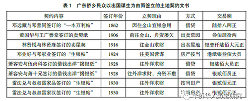 近年来,学术界对侨乡契约文书的关注越来越多,并以此为对象展开研究。有些学者以珠江三角洲地契为研究对象,但未将侨乡契约文书作为独立的概念和范畴进行探讨。如谭棣华、赵令扬从经济学角度考察了广州爱育堂契约文书,认为土地自由买卖是清代珠三角洲农村地权转移的主要方式。冼剑民依据明清时期广东地契文书,探讨了商品经济对土地买卖的冲击以及土地兼并等问题。石坚平将广府侨乡契约文书作为研究对象,探讨了货币表达方式、图甲户籍问题及侨乡社会衍变的模式。龙登高探讨了中国土地产权形态与地权交易体系,认为土地的多样化交易帮助农户以土地为中介实现了跨期调剂与资金融通,延续了家庭经济与再生产。他提出的地权交易理论,有助于理解近代侨乡出国移民与土地流转的关系。
