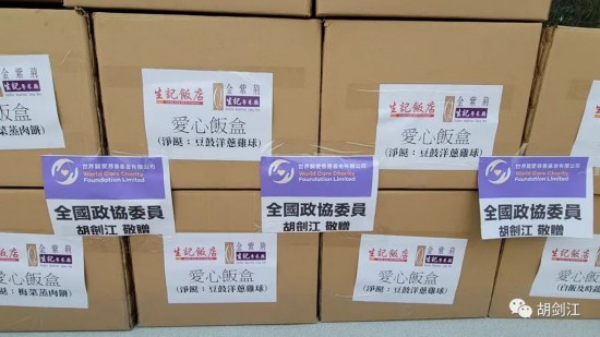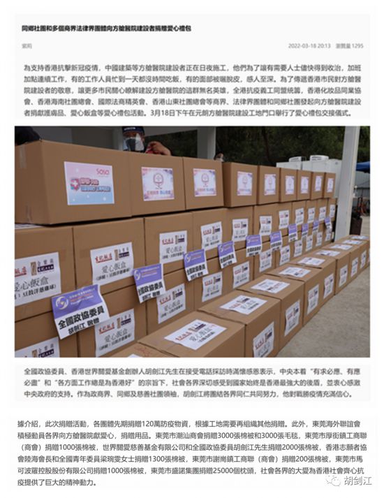 3月18日,紫荆杂志刊发新闻《同乡社团和多个商界法律界团体 向方舱医院建设者捐赠爱心礼包》,讲述当天下午香港商界、法律界团体和同乡社团发起向方舱医院建设者捐献护肤品、爱心饭盒等爱心礼包活动。港区全国政协委员、世界关爱慈善基金有限公司胡剑江继3月10日向方舱医院捐赠2000张棉被后,再次捐赠一批爱心饭盒,向方舱医院建设者和抗疫一线慰问致敬。