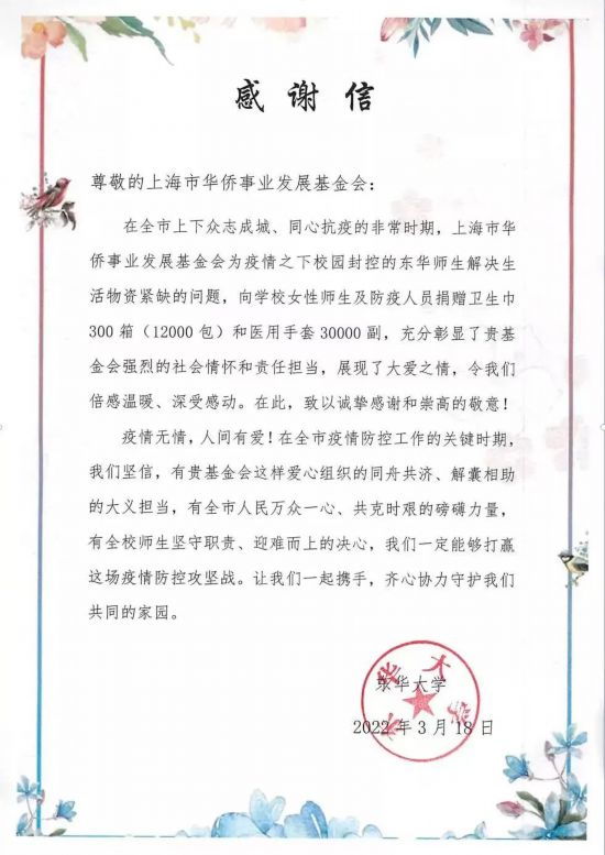 针对高校防疫物资紧缺的问题,通过市教委,向上海相关高校捐赠睡袋2500个,向上海交大闵行校区、东华大学、上海师范大学奉贤校区、上海大学、复旦大学上海医学院、上海交通大学医学院、同济大学医学院、上海中医药大学等捐赠医用手套、消毒喷雾罐、饮用水、茶饮品、卫生巾、安睡裤、湿厕纸等防疫急需物品。