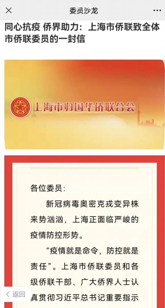 3月16日,上海市侨联通过委员履职服务平台向全体市侨联委员以及各级侨联组织、广大侨界人士发出一封公开信,号召广大侨联委员和侨界人士带头投身抗疫,加强自身防护,广泛宣传抗疫举措和知识,积极投身社区志愿服务;全市各级侨联特别是基层侨联组织迅速行动,密切联系侨界群众,为疫情防控汇聚力量;关心关爱持续奋战在抗疫一线的人员,弘扬先进事迹,积极帮助解决他们的后顾之忧;投身公益事业,尽己所能提供捐赠,助力满足疫情防控一线的紧迫需求;立足本职,继续扎实做好促发展、保安全各项工作,为保持和巩固全市经济社会平稳健康发展的局面付出更大努力。